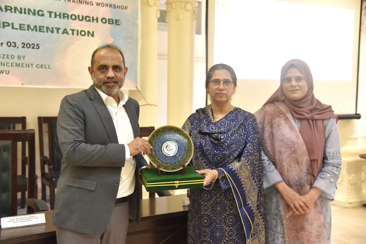 In her closing remarks, Prof. Dr. Bushra Mirza (Pride of Performance, T.I.), Vice Chancellor FJWU, appreciated the efforts of QEC and the resource person, highlighting the significance of OBE in enhancing academic quality and continuous improvement. The event concluded with certificate distribution, souvenir presentation, and a group photograph.